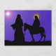 Celebrate the true meaning of Christmas. Joseph leading Mary's mule across the desert en route to Bethlehem, following the North Star. Silhouette against a night background. Multi colour drawing.