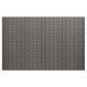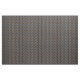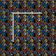 This fabric has a mid-century modern design of oval halves, some solid and some striped, in masculine colours on a field of dark grey.