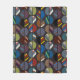 This medium fleece blanket has a mid-century modern design of oval halves, some solid and some striped, in masculine colours on a field of dark grey.