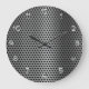 Masculine wall decor clock with modern simulated metal background designed to look like there are holes in the metallic surface with numbers that stand out on the clock face. Designed for a guys room, office wall in an automotive business, or kitchen clock in a ultra modern kitchen decor environment.