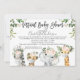 Sweet and elegant girl's safari animals wearing masks, baby shower invitation featuring four jungle animals, some pink floral arrangements and some foliage. This is a sweet way to invite guests to a little girl's virtual safari themed baby shower.