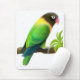 Airbrush painting of a green Masked Lovebird, a popular little pet parrot originally from Africa. Lovebirds are best kept in pairs. Illustration by Carolyn McFann.