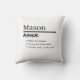The front of the pillow features the name "Mason" prominently displayed in elegant typography, while underneath, you'll find a delightful definition that captures the essence of Mason's personality. This thoughtful touch adds a personalised flair to the pillow, making it a meaningful addition to any sofa, bed, or armchair.