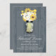 Wedding Rehearsal Dinner Announcement. Background in Medium Grey Rustic Barn Wood design with a Mason Jar filled with white daisies, sunflowers and yellow Billy Balls. If the colour scheme is not what you wanted please let me know and I'll recreate that for you but please contact me before placing an order. Email paula@labellarue.com Happy Wedding Planning!
