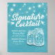 Signature Cocktail Drink Menu Wedding Decor Poster Templates - Elegant Lettering Script and Vintage Couple Mason Jars and String Lights on Light Blue Floral Background.