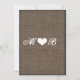 Rustic Country Mason Jar Burlap Print Wedding Invitation Template with purple lavender flowers in a canning jar wrapped with lace with the bride and groom's initials with a heart at the top. These unique country wedding invitations are perfect for any rustic themed wedding. The couple's initials and the heart are also on the back of the invitation on the rustic distressed printed burlap design background.