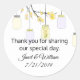 Pretty round wedding favour sticker done in white, with graphics of white and yellow mason jars, hanging off a yellow coloured blossoming tree limb. Personalise the text for your wedding. Matching products are available.