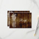 Rsvp reply cards. Mason jar stamped image in white, on a dark brown wood plank background image (not real wood). A semi grungy outdoor theme for a country summer or cabin wedding. THE dark chocolate brown wooden boards from an antique fence or floorboards contrast against a white cutout stamped outline image of a mason jar with baby's breath and other lacy wildflowers. All Designs Copyright © www.CustomInvitesOnline.com