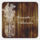 Adorable square shaped envelope seal or sticker for wedding guest favours. Mason jar stamped image in white, on a dark brown wood plank background image (not real wood). A semi grungy outdoor theme for a country summer or cabin wedding. THE dark chocolate brown wooden boards from an antique fence or floorboards contrast against a white cutout stamped outline image of a mason jar with baby's breath and other lacy wildflowers. All Designs Copyright © www.CustomInvitesOnline.com