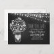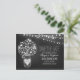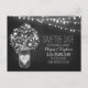 Chalkboard save the date postcard with mason jar full of wildflowers, daisies, leaves and love hearts and glowing twinkle lights hanging on the wire. Romantic and rustic cute slate grey chalkboard save the date postcards with big love heart and bride's and groom's initials in it.