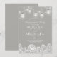 This elegant engagement party invitation features a delicate white lace design along the bottom border and glowing mason jars and string lights along the top. Perfect for an outdoor or rustic themed engagement party. Background colour can be fully customised to match your event theme. Sample is shown with a grey coloured background.