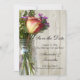 Save the date cards. Clear glass mason jar photograph with a red and yellow rose, and purple, white and yellow wildflowers. A lovely theme for a natural, summer, outdoor vintage wedding. Summer wild garden theme, with light whitewashed wood planks in the background. All Designs Copyright © www.CustomInvitesOnline.com