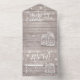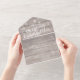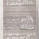 Modern Wedding invitation with Detachable RSVP Postcard Template - Elegant Lettering Script and Vintage Couple Mason Jars and String Lights on Rustic Wood Background.