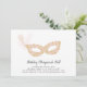Elegant masquerade ball invitations for your a special birthday or any party occasion feature an ornate mask in blush pink and gold, adorned with a feather. Personalise with your party details beneath in black calligraphy script and block lettering.