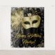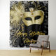 Masquerade birthday party backdrop with beautiful gold masquerade mask on a pretty black, gold and white bokeh background. This beautiful black and gold masquerade party backdrop banner is easily customised with the text of your choice. You can change the background and text colour.