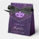 A stylish purple damask background. Decorated with purple light strings and a masquerade mask. Personalise and add a text, name and age.