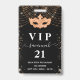 A modern, stylish and glamourous badge for a 21st (or any age) birthday party. A black background with dark faux gold glitter and a masquerade mask. With the text: VIP. Personalise and add name, age, address/date. The name is written with a modern hand lettered style script with swashes.