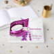 This guest book has a festive masquerade mask in purple surrounded by white feathers and includes a strand of purple beads. While shown as a Quinceanera, this can be customised for any event.