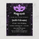For an elegant Masquerade, 21st (or any age) birthday party. A classic black background. Decorated with purple faux glitter sparkles and a masquerade mask. Personalize and add a name, age and party details. The name is written with a hand lettered style script