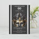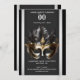A beautiful watercolor graphic of a charcoal silver and faux gold fae mask adorned with dark grey feathers. The face mask is set against a black background edged with faux silver vertical lines that enclose pale grey text templates for your custom wording. These are ideal for a masquerade; masked ball; mask theme birthday or festival celebration.