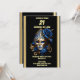 A beautiful watercolor graphic of the face of a woman wearing a blue and gold decorative mask adorned with a blue large rose flower. She is set against a black background edged with faux gold vertical lines that enclose pale golden text templates for your custom wording. These are ideal for a masquerade; masked ball; mask theme birthday or festival celebration.