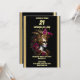 A beautiful watercolor graphic of a woman with her face turned slightley towards you wearing a gold face mask adorned with vintage gold and fuchsia decorative elements. Her white face and lusious red lips pop against the black background. She is wearing a ruffled floral top that gives a carnival / festival feel to her overall look. Faux gold vertical lines that enclose pale golden text templates for your custom wording. These are ideal for a masquerade; masked ball; mask theme birthday or festival celebration.