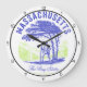 Display your Massachusetts state pride, with this charming wall clock. It features the Bay State heritage, showcasing a historical Minuteman forest home, design. An established 1788 gift, celebrating Revolutionary history. This Massachusetts wall clock, adds timeless Colonial charm to any home. Perfect for any one.