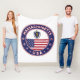 Badge of Massachusetts with flag of Massachusetts and flag of USA colours, rounded shape.