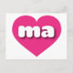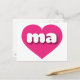 This postcard features a vibrant hot pink heart containing the bold, white, rounded lower case letters ma, a playful abbreviation for the state of Massachusetts, the bay state. The reverse side of the postcard is blank, awaiting your customised text or handwritten sentiments.