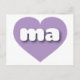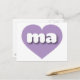 This postcard features a cool, lavender heart containing the bold, white, rounded lower case letters ma, a playful abbreviation for Massachusetts, the bay state. The reverse side of the postcard is blank, awaiting your handwritten sentiments or customised text.