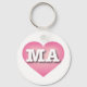 This key chain features features a calm, cool, and collected pink heart with a white washed centre containing the bold, white, upper case letters MA, the official abbreviation for Massachusetts, the bay state.