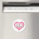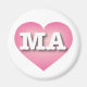This magnet features a pink heart with a white- washed centre containing the bold, white, upper case letters MA, the official abbreviation for Massachusetts, the bay state.