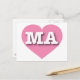 This postcard features a vibrant pink heart containing the bold, white, upper case letters MA, the official abbreviation for Massachusetts, the bay state. The reverse side of the card is blank, awaiting your personalised text or handwritten sentiments.
