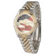 The watch is very nice, the picture is great and the watch looks like quality. The only problem I am having with it is that it is a little too large, and I also can't figure out how to open the clasp. No directions came with it. Very good. The printing is perfect and the watch keeps good time.