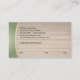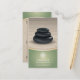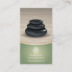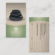 This spa business card exudes serenity. Three massage stones are stacked on a clean wood surface coordinating with a curved sage green panel below. The business name is enhanced by a sun ornament with either a website or a phone number below. The wood panels are repeated on the reverse to show all contact information plus an area for appointment reminders. The sun ornament can be replaced with your own logo or other image if desired. Available in alternate colours with matching products.