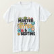 This fun t-shirt design is for geek dads. It has a pixel art-style illustration of a cute fluffy creatures, a little baby and a funny text saying "master of bytes and bedtime".