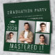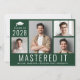 Modern masters degree green graduation party invitation featuring a 4 picture photo collage, "Mastered It" written in large white capital letters and his or her class year, name and school or university in simple white typography. On the reverse side, add the grad party details.