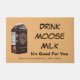 A milk carton from world famous and entirely mythical Matanuska Moose Milk dairy farm in Willow Alaska; not too far from Anchorage. The slogan "Drink Moose Milk, It's Good For You" also appears. The logo image features a milkmaid hand milking Matilda, the farm's first dairy moose. Believe it or not there are moose dairies; a small number in Russia and one in Sweden. Moose milk is commercially farmed in Russia. A farm-born moose calf is taken from its mother within 2–3 hours after birth and is raised by people. It is first bottle-fed with a milk substitute, and later fed from a bucket. The animals imprint and become attached to humans. The milk is high in butterfat (10%) and solids (21.5%), according to data collected on Russian moose; research into American moose milk is in a less advanced state than in Russia, but appears to indicate that American moose have even higher concentrations of solids in their milk. Moose milk is said to be a bit salty and bitter; with a hint of pine or spruce needles. Moose milk is commercially farmed in Russia. A farm-born moose calf is taken from its mother within 2–3 hours after birth and is raised by people. It is first bottle-fed with a milk substitute, and later fed from a bucket. The animals imprint and become attached to humans. As with dairy cattle, calves are removed from their mothers after a short time.The Russians say moose soon recognise the milkmaids as their substitute as her substitute calves. At this point they are released to the forest; but visit the farm every day to be milked during the lactation period (typically, until September or October). During winter the animals roam free throughout the surrounding forest. But they usually do not stray too far, but spend much of their time at nearby woodlots where trees are being cut, feeding on the byproducts of timber operations. And they know the farm as the place for a daily rations of oatmeal, and as a safe place to give birth to their young. One Russian sanitorium serves moose milk to residents in the belief that it helps them recover from disease or manage chronic illness more effectively. Some Russian researchers have recommended that moose milk could be used for the prevention of gastroenterological diseases in children. The Elk (Moose are called Elk in Europe) House (Älgens Hus) farm in Bjurholm, Sweden is believed to be the world's only producer of moose cheese. The cheese sells for about 500 dollars per pound. Algens Hus' restaurant offers moose-cheese dishes. Cheese plain with bread or biscuits, or better yet, frozen moose mousse. Best served with raspberries.