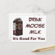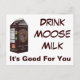 A milk carton from world famous and entirely mythical Matanuska Moose Milk dairy farm in Willow Alaska; not too far from Anchorage. The slogan "Drink Moose Milk, It's Good For You" also appears. The logo image features a milkmaid hand milking Matilda, the farm's first dairy moose. Believe it or not there are moose dairies; a small number in Russia and one in Sweden. Moose milk is commercially farmed in Russia. A farm-born moose calf is taken from its mother within 2–3 hours after birth and is raised by people. It is first bottle-fed with a milk substitute, and later fed from a bucket. The animals imprint and become attached to humans. The milk is high in butterfat (10%) and solids (21.5%), according to data collected on Russian moose; research into American moose milk is in a less advanced state than in Russia, but appears to indicate that American moose have even higher concentrations of solids in their milk. Moose milk is said to be a bit salty and bitter; with a hint of pine or spruce needles. Moose milk is commercially farmed in Russia. A farm-born moose calf is taken from its mother within 2–3 hours after birth and is raised by people. It is first bottle-fed with a milk substitute, and later fed from a bucket. The animals imprint and become attached to humans. As with dairy cattle, calves are removed from their mothers after a short time.The Russians say moose soon recognise the milkmaids as their substitute as her substitute calves. At this point they are released to the forest; but visit the farm every day to be milked during the lactation period (typically, until September or October). During winter the animals roam free throughout the surrounding forest. But they usually do not stray too far, but spend much of their time at nearby woodlots where trees are being cut, feeding on the byproducts of timber operations. And they know the farm as the place for a daily rations of oatmeal, and as a safe place to give birth to their young. One Russian sanitorium serves moose milk to residents in the belief that it helps them recover from disease or manage chronic illness more effectively. Some Russian researchers have recommended that moose milk could be used for the prevention of gastroenterological diseases in children. The Elk (Moose are called Elk in Europe) House (Älgens Hus) farm in Bjurholm, Sweden is believed to be the world's only producer of moose cheese. The cheese sells for about 500 dollars per pound. Algens Hus' restaurant offers moose-cheese dishes. Cheese plain with bread or biscuits, or better yet, frozen moose mousse. Best served with raspberries.