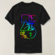 An abstract pattern of geometric and mathematical shapes and symbols on a dark t-shirt.