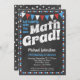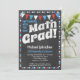 A fun and unique math degree graduation party invitation in chalkboard style with red, white and blue flags and a whimsical polka-dot border with dots on the back.