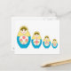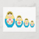 Folk art style Matryoshka's, or Russian Nesting Dolls, grace this product. All of the matryoshka's are wearing yellow scarves and blue dresses and adorned with dark pink flowers.