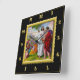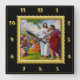 Matthew 14:13-21.Jesus Feeds 5000 Men Vintage Square Clock. Has a photo of Jesus turning fish and bread into more food. To feed the many people that are hungry sitting on the green grass with the blue sky above them. Very colourful design. This is a vintage photo from the early 1900.This clock has gold numbers from 1 to 12.gold frame and the black background. The background colour can be change to any colour you want it to be with the custom tag.