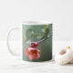 Inspirational scripture coffee mug depicts a nature photograph of a branch of beautiful pink flowers and green leaves. It features Bible Verse Matthew 19:26, Jesus said, “With man this is impossible, but with GOD all things are possible.”
