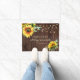 Rustic doormat depicts floral watercolor yellow sunflowers and greenery with string lights and dark wood. It features a portion of Bible Verse Matthew 19:26, "With God all things are possible."_
