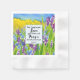 Christian inspirational quote scripture napkin depicts an artistic watercolor painting with purple and blue flowers, greenery and a blue sky. It features Bible Verse Matthew 5:44, in the words of Jesus, “But I say to you, Love your enemies and pray for those who persecute you.”