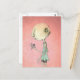 Illustration of a cute girl Maud, holding Her dragonfly with delicate Fingers. She has Bald Head and expressive eyes. She looks like an Alien with her dragonfly buddy. On a ''pink grapefruit'' coloured background and ''flower silhouettes'' this illustration of a girl and her Dragonfly will enchant anyone.