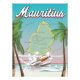 Illustrated map of Mauritius in a beautiful vintage or retro style, featuring a sea plane landing on a beautiful beach.