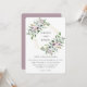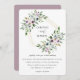 Beautiful bohemian style flowers and foliage in shades of mauve, white and green, adorned on layered golden geometric frame, wedding invitation. Back of card features solid mauve shadows colour.