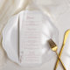 Elevate your reception table with this mauve floral wedding menu, featuring elegant script, minimalist layout, and a delicate flower illustration. Perfect for romantic, pastel, or modern wedding themes, this menu adds a refined and personal touch to your place settings.